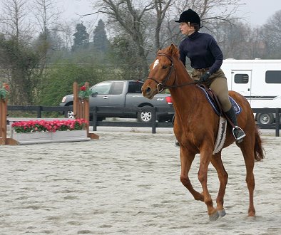 Hi, What a fabulous weekend! The slow, consistent, steady route is paying off. Brett and I went to our first horse show Sunday. It was a locally recognized show (points were accumulated) so Joan entered us under Brett's show name. Since casual dress was allowed, and I was there simply to school and let him get some show miles, I was not dressed for the party, wearing chaps and paddock boots. We entered three classes--an adult eq class which was held in the small indoor arena (we only entered the walk-trot class), and two pleasure horse classes, one walk trot, one walk, go as you please (trot for us). Those were in the big outdoor ring. Brett found the indoor ring scary, but got comfort from his 'new best friend' Smokey. When Smokey left, he learned that any horse in the ring could be his 'new best friend,' so he settled in better that I could ever have hoped for. He was good in his class--a little bobble when we reversed and there was no horse in front of him cause a spook and stop--but then he regained his confidence and went on well. I was SO proud of him.