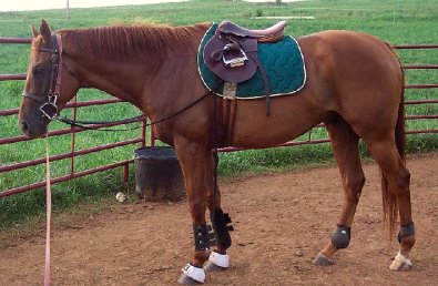 I have been working him almost every day. Yesterday was really neat, I could tell he was really settled with me and everything I did with him. He just had this peace about him that I haven't seen yet. He finally started giving to the side reins yesterday when I was lounging him, which was good to see. Under saddle I have been working on walk, trot, and whoa transitions and bending. He is actually better to the right, which really surprised me. Last week I lunged him in the front field for the first time and took him over trot poles and a small cross rail and he acted like he had been doing it all his life. He actually didn't even try to jump the cross rail, he just trotted over it. I love how brave and easy going he is, nothing really bothers him. The only thing we are having to work through is when I curry him on the back he kicks out. He has gotten a little better with this, I just keep me out of fire zone. I think it was a combination of a couple of things. One being that it tickles, I find when I put some pressure behind it he does better. The second being that he was a little sore. My equine massage therapist came out and adjusted him last week and she said his back a out just a little, but everything else was fine. He has already gotten better with this, I think it will be something that will phase out completely soon. Mary Jennifer July 31, 2007Elizabeth,