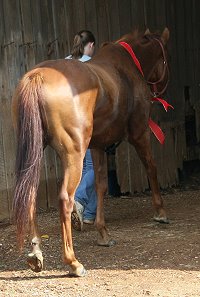 July 29, 2007Elizabeth, This morning I took him for a walk after breakfast. He got to see some more of the farm and got to graze. We worked on stopping, backing up, and standing still while on our walk. He was still a little excited and trying just to take everything in, but nothing unmanageable. After his walk I put him back in his stall while we ran to town.
