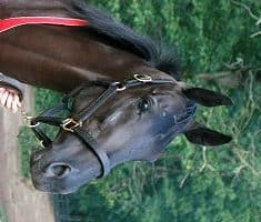 So Romeo is a 2002, 16 hand, dark bay (almost black) Thoroughbred gelding. He is by Peaks and Valleys who was the Canadian Champion three year old colt and Horse of the Year in 1995. So Romeo was starving in the pasture after he left the track ,when we found him again. He is fat and happy now but looking for a new partner to take him to the show ring. He is very talented and quick. So Romeo loves to work and really wants to bond with a special person. This horse has a real can do attitude and he is extremely talented. He should go to a show home to show off his many talents. So Romeo would excel as a jumper or event horse. He is forward moving and extremely athletic with a willing attitude. So Romeo loves to work and he wants to find a partner who is a brave and bold as he is so that they can have fun together competing.