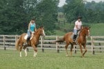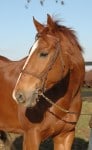 “Brass” is a 2004, 16 hand chestnut Thoroughbred gelding for sale from his breeder. He never raced or was in race training. She broke him when he was a two year old and he never gave her a moment’s trouble. She has enjoyed him as a pleasure horse just to ride on the farm whenever time allowed it. He is easy to ride and he is no problem even after some time off. Brass is comfortable in company of other horses as well as alone. Two of the pictures below show him as a baby-sitter for a two year-old filly being ridden in the paddock for the first time – he was a wonderful influence. She has never had any difficulties riding him away from the barn in a big open field without other horses for company. He is happy to walk, trot and canter “on the buckle” and he knows his leads. Brass has only been trailered a few times, but loaded willingly and without hesitation every time. His ground manners are very good.